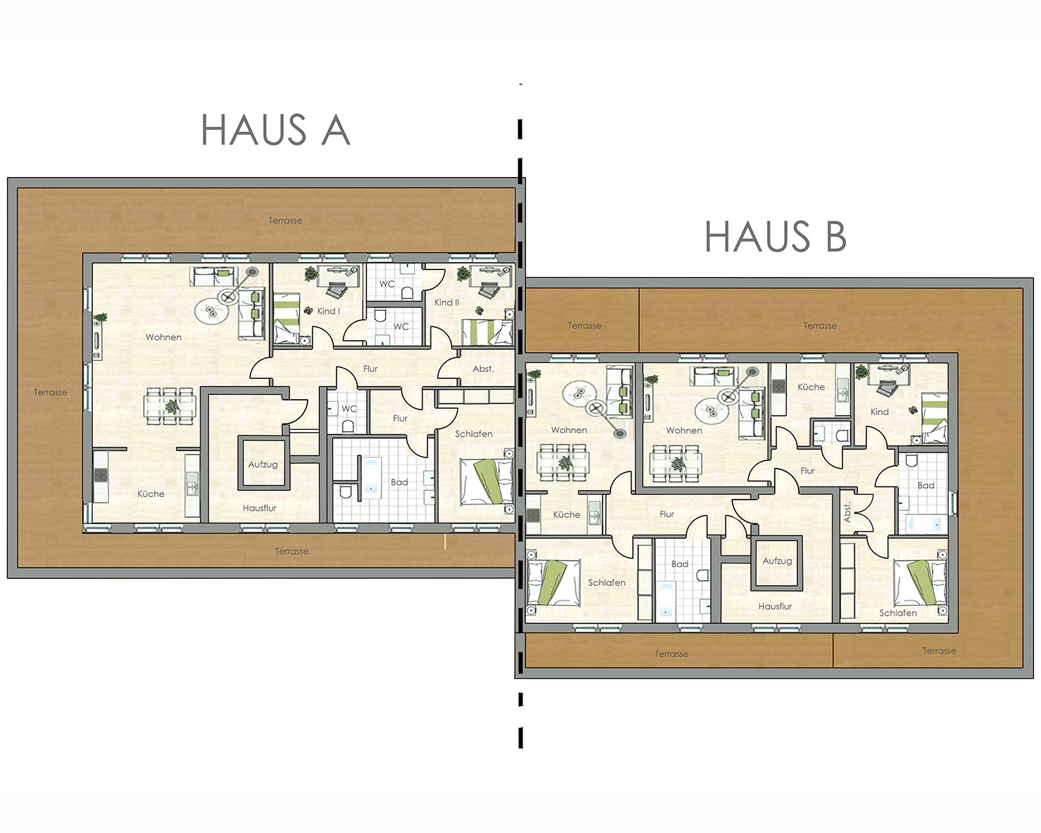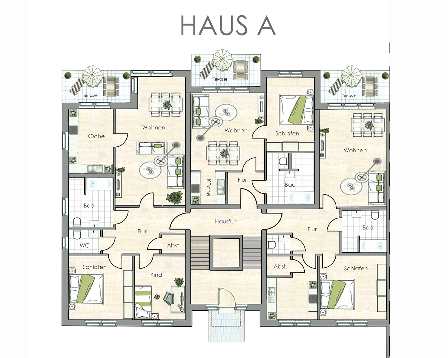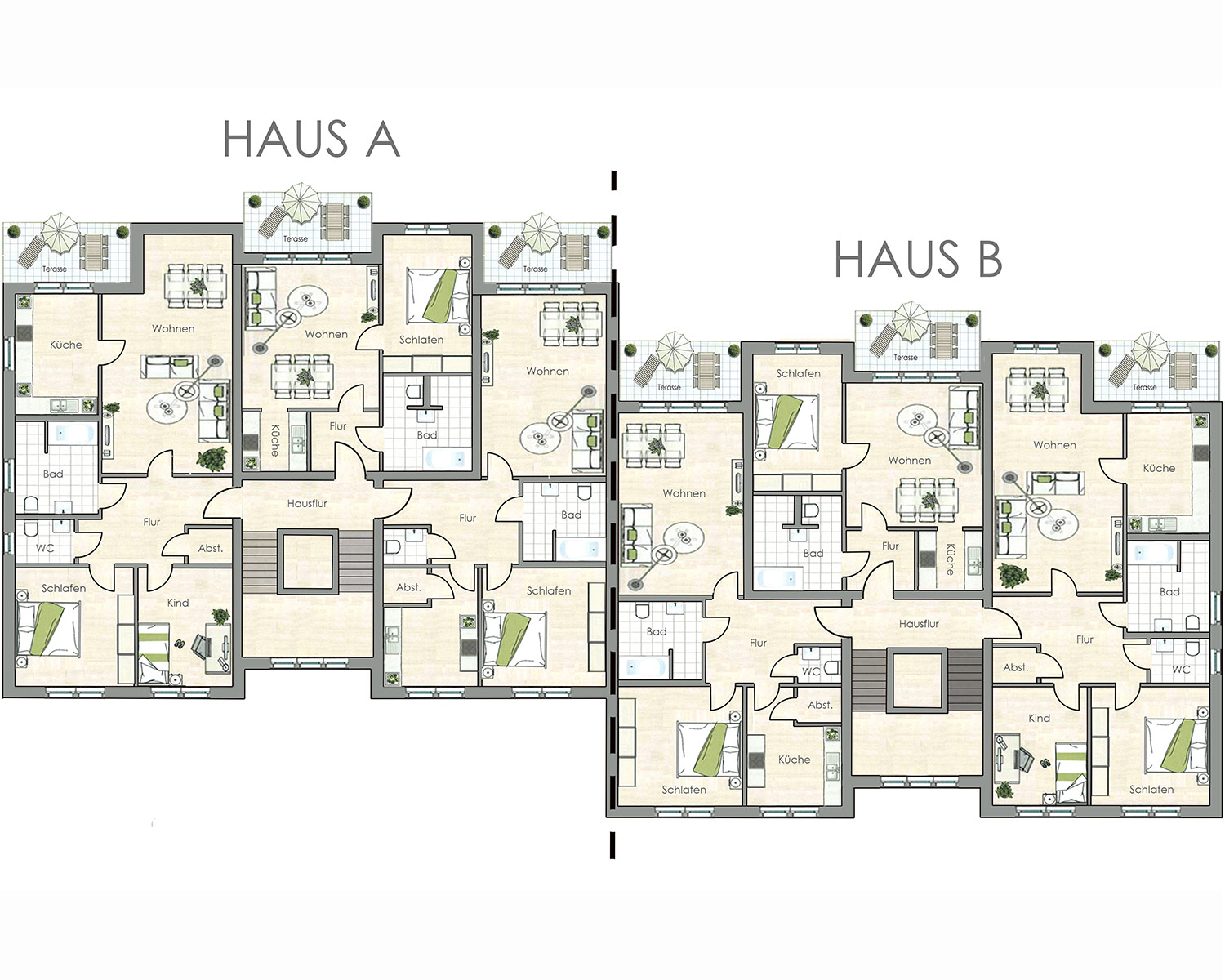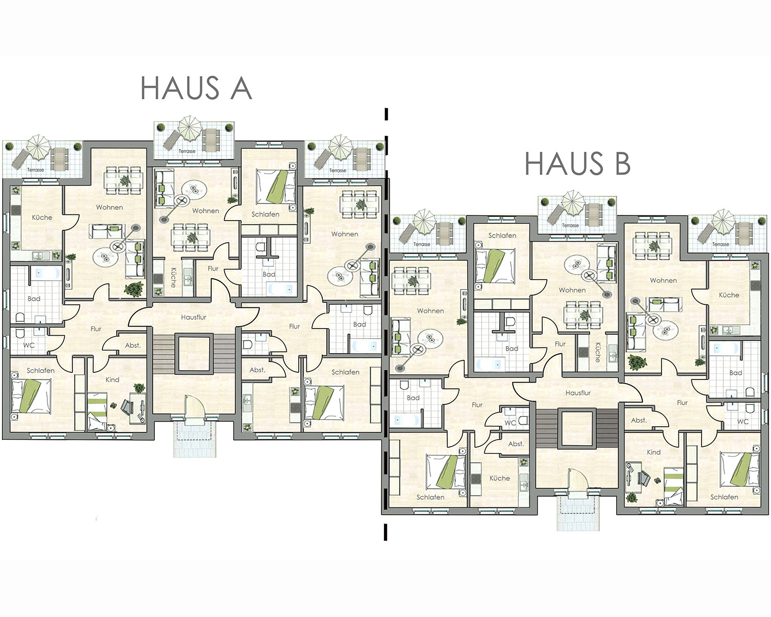 Errichtung von zwei Mehrfamilienhäusern zur Kapitalanlagein Dortmund Wellinghofen: Die Platzierung der Häuser auf dem Grundstück ist von der Ausrichtung optimal. Die Terrassen und Balkone sind alle sonnig nach Westen ausgerichtet. Durch eine eigene Zufahrt, an der südlichen Grundstücksgrenze, erreicht man die Stellplätze, die sich, aufgrund der großen Grundstückstiefe, im hinteren Bereich befinden. Hierdurch erhalten alle Terrassen und Wohnungen einen wunderschönen Blick ins Grüne.