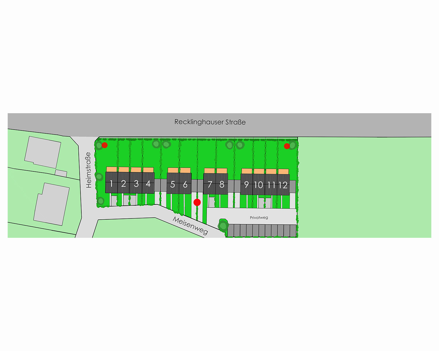 Wohnen in familienfreundlicher Lage: In dem Wohnquartier in Castrop-Rauxel sind 12 Reihenhäuser und Doppelhaushälften geplant. Die Häuser haben eine Breite von 6 Metern und sind somit großzügig und hell gestaltet. Eine sonnige Ausrichtung ist selbstverständlich. Die Häuser haben eine Wohnfläche von 94 oder 124 m². Die Grundstücksgrößen liegen zwischen 188-343 m².